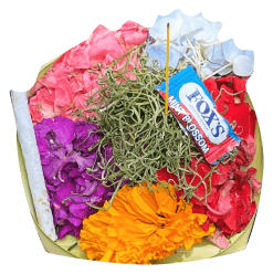 It's a traditional Balinese offering called "canang sari." Typically, it's a floral arrangement crafted with palm leaves and filled with flowers, rice, and other symbolic items (sometimes including cigarettes or candies). Offerings are placed twice daily in temples, homes, and other sacred spaces as a way to express gratitude, respect, and devotion to the gods and spirits in Balinese Hindu culture.